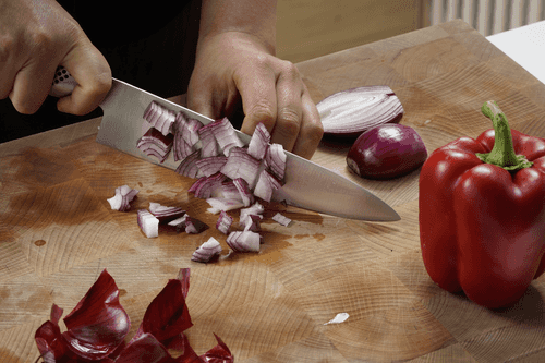 Разогреть духовку до 180 градусов. Красный лук и сладкий перец нарезать средними кубиками.
