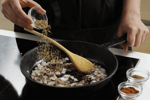 Нагреть оливковое масло. Обжарить на среднем огне лук с орегано, паприкой и зирой.
