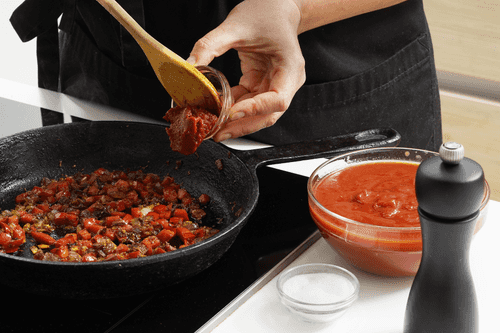 Через 2 минуты добавить в сковороду консервированные помидоры, томатную пасту, соль и перец. Перемешать. Слегка убавить жар и продолжать готовить овощи около 5 минут.