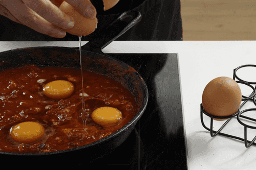 Сделать углубления в соусе и осторожно разбить в них яйца.