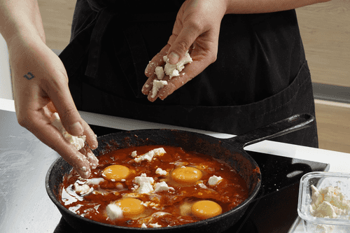 Посыпать шакшуку фетой. Через минуту отправить сковороду в духовку на 7–10 минут. Белок должен схватиться, а желток остаться жидким. Накрывать сковороду не нужно.
