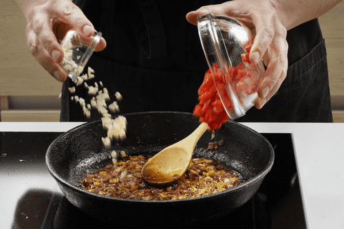 Когда лук станет прозрачным, добавить чеснок и красный перец.