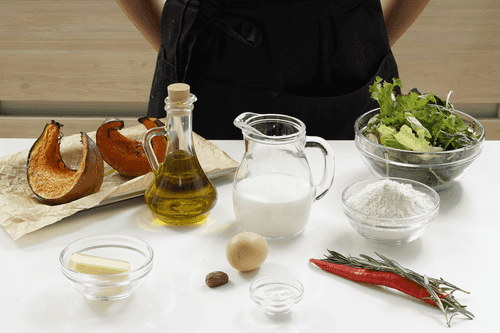 Подготовить все ингредиенты. Тыкву предварительно запечь в духовке при 200 градусах в течение 25–30 минут.
