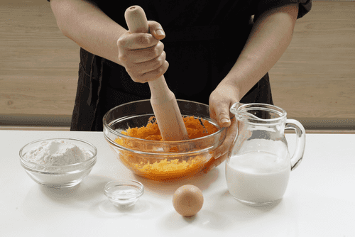 Тыкву размять в большой миске, смешать с яйцом, молоком, мукой и разрыхлителем.