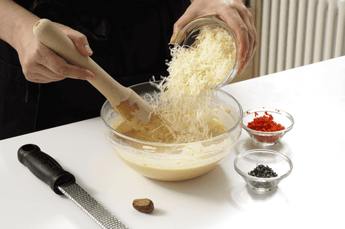 Добавить чили, розмарин, сыр, пармезан и щепотку мускатного ореха. Посолить и перемешать.