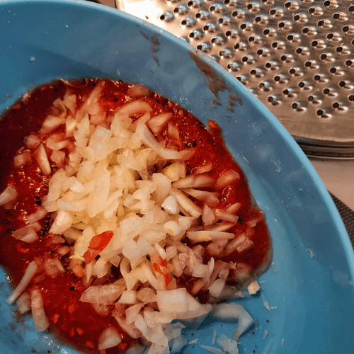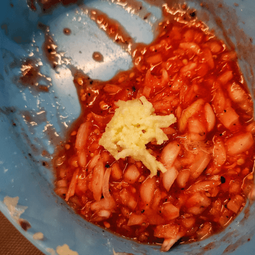 Выдавить чеснок с помощью пресса. Снова перемешать.