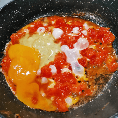 В разогретое на сковороде масло вбить яйцо и добавить мелконарезанную треть помидора.