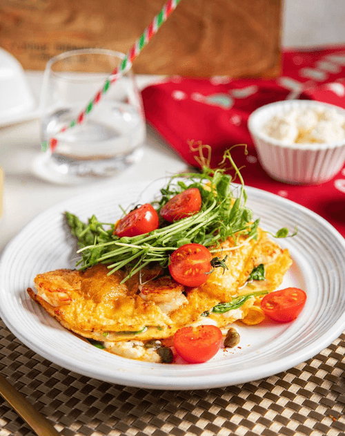 Омлет без молока с креветками, фетой и каперсами
