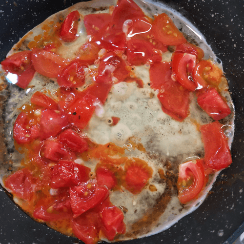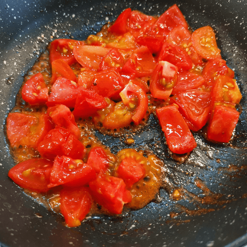 Сковороду поставить на сильный огонь, добавить масло. Затем выложить помидор.