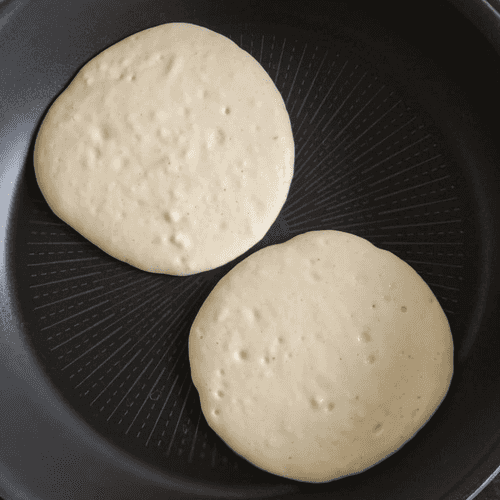На горячую сухую сковороду вылить столовой ложкой тесто, сформировав форму панкейков. Выпекать с обеих стороной по 2–3 минуты.