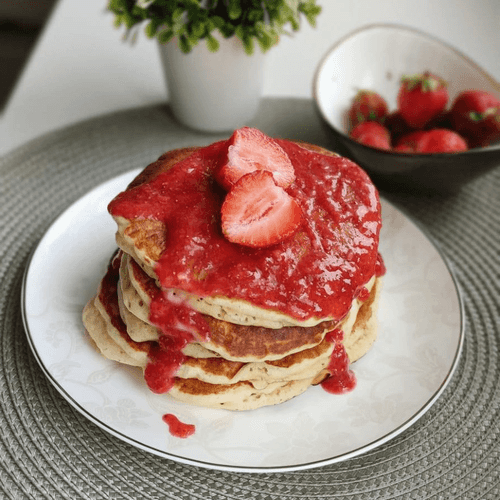 Панкейки с клубничным соусом – классический десерт американской кухни, любимый за свою нежность и воздушность. Их история восходит к древним лепешкам, но именно в США они приобрели свою современную форму. Кефирное тесто делает панкейки особенно мягкими, а добавление клубничного соуса придаёт им освежающий фруктовый оттенок. Сладкая ягода, взбитая с сахаром, создаёт ароматную и насыщенную текстуру, которая идеально сочетается с тёплыми, золотистыми лепёшками. Эти панкейки – прекрасный вариант для завтрака, уюта выходного дня или десерта к чашке кофе. Их можно подавать с дополнительными ягодами, мёдом или орехами для разнообразия вкусов. Легкость приготовления делает их популярными среди любителей домашней выпечки, а насыщенный вкус – фаворитом на любом столе.