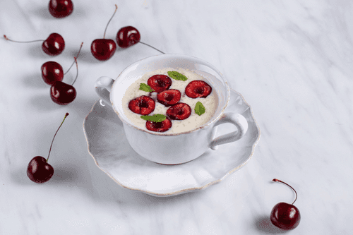 В сотейник к рису добавить топленое молоко, 4 столовые ложки маринованной черешни.
