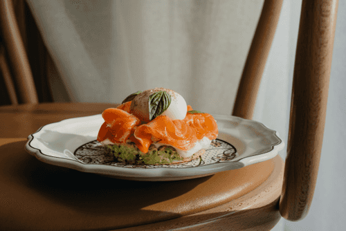 Сверху положить кусочки лосося, а на рыбу — яйцо пашот.