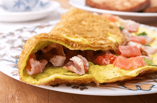 Жарить до тех пор, пока омлет не подрумянится снизу. Затем свернуть омлет лопаткой. Подавайте на стол сразу.