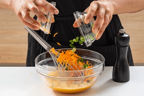 Добавить к яйцам зеленый лук и морковь, поперчить.