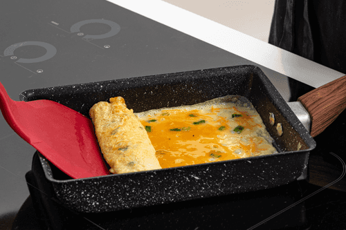 Сдвинуть рулет на противоположный край сковороды и на дно вылить еще немного яичной смеси, также чтобы она покрывала дно. Слегка приподнять рулет, чтобы яичная смесь соединилась с краем омлета. Как только схватиться дно, снова свернуть омлет в рулет.