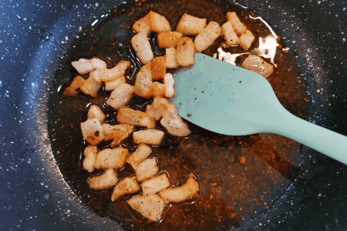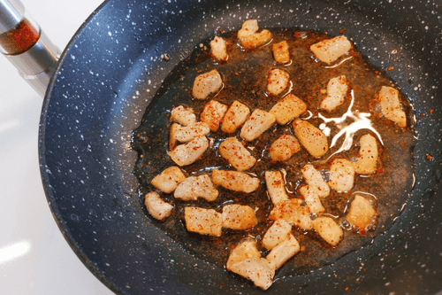 На сухую разогретую сковороду выложить сало, поперчить. Обжаривать 2 минуты на сильном огне.