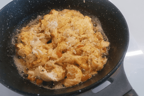 Убавить огонь до среднего и влить яйца к шкваркам.