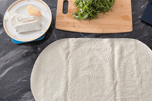 Нарезать руколу помельче и посыпать на лаваш. Посолить.