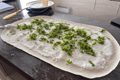 Разогреть духовку на 150 градусов. Развернуть лаваш, намазать на него творог и сверху сметану.