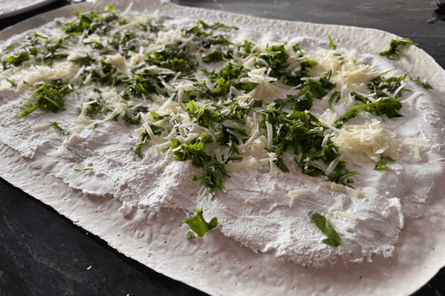 Пармезан натереть на терке и добавить сверху. Свернуть лаваш.