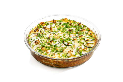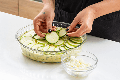 Сверху красиво выложить отложенные сырые кабачки и посыпать оставшейся фетой. Отправить в духовку на 35–40 минут. Если сверху запеканка начнет подгорать, накрыть ее фольгой. Готовой запеканке дать немного остыть на решетке.
