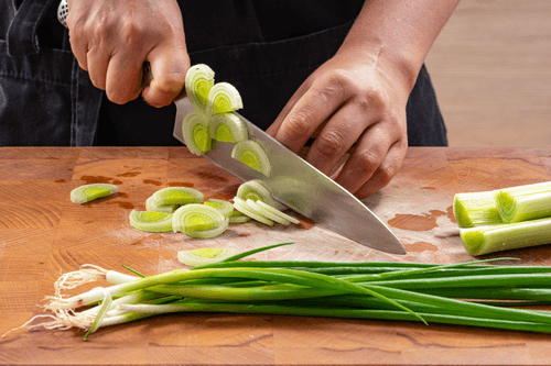 У лука-порея отрезать зеленую часть (ее можно заморозить и использовать для бульонов), белую часть хорошо промыть от песка и нарезать полукольцами. Зеленый лук нарезать колечками.