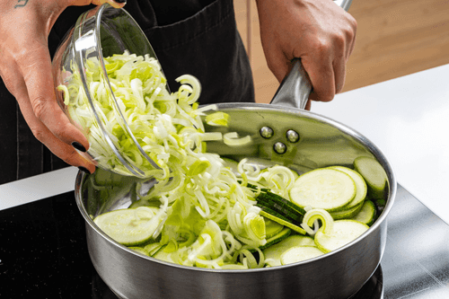 В большой сковороде разогреть оливковое масло, всыпать лук-порей и ¾ нарезанных кабачков.