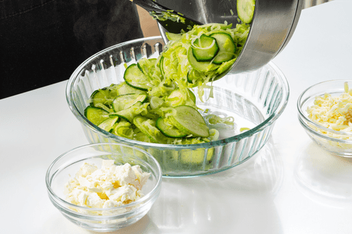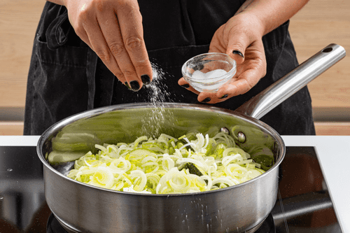 Добавить половину соли и тушить, помешивая, до мягкости, 4–5 минут. Затем снять с огня и оставить на 5 минут.