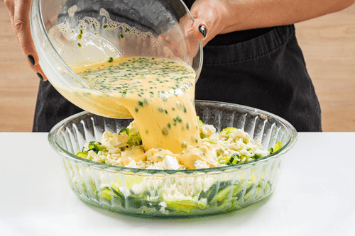Форму для выпечки смазать растительным маслом. Выложить тушеные кабачки, на них выложить моцареллу и половину тертой феты.