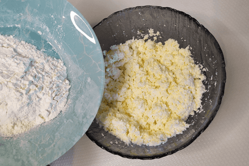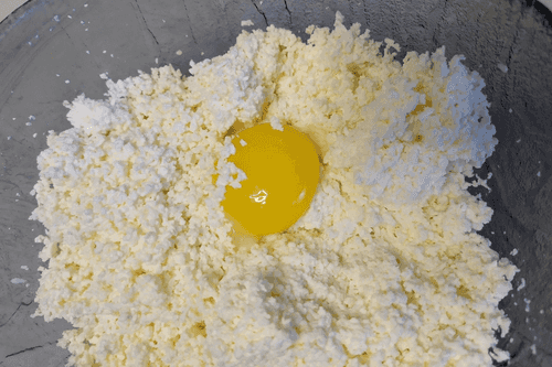 Добавить предварительно просеянную муку. Перемешать. Должна получиться однородная масса, из которой легко формируются шарики.