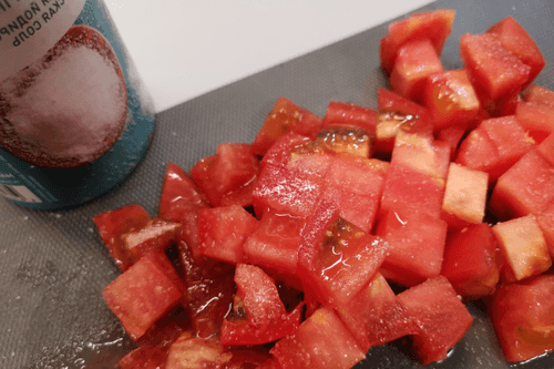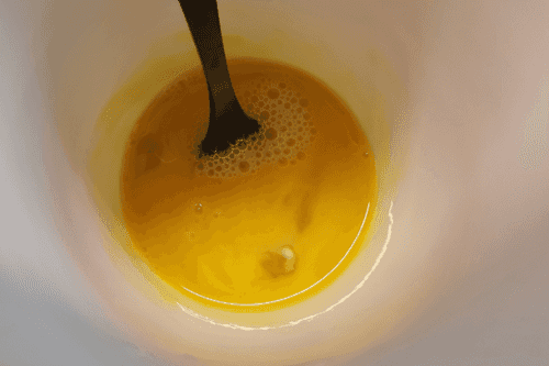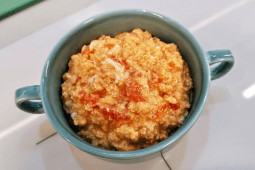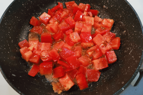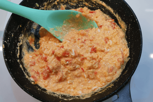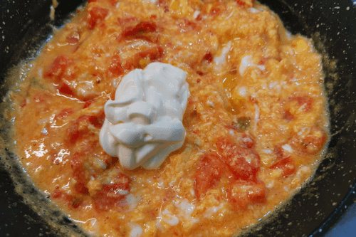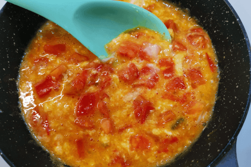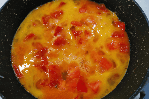 Через 2 минуты перемешать помидоры и влить яичную смесь.