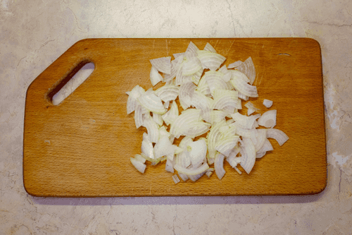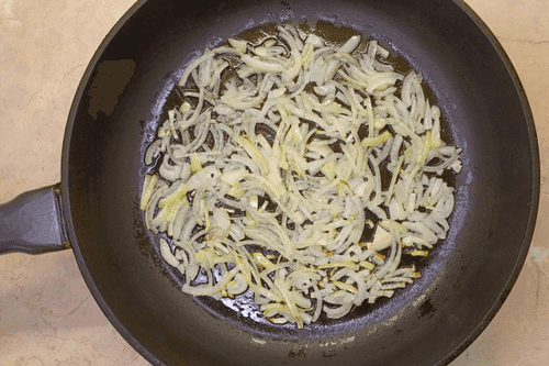 Разогреть на сковороде растительное масло, выложить лук, пассировать до прозрачности.