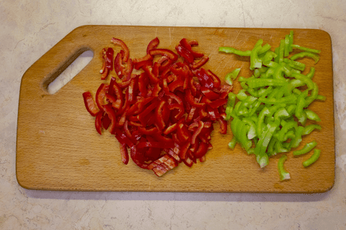У перца удалить семена и перегородки. Нарезать перец тонкой соломкой.