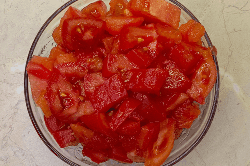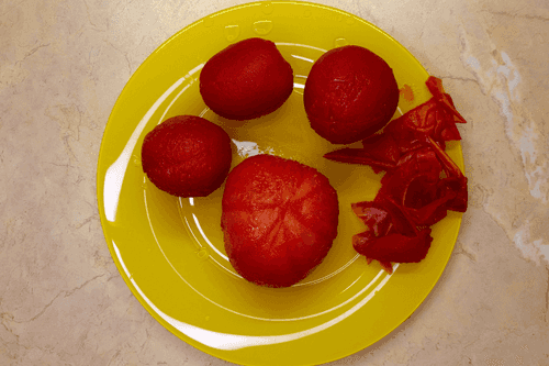 Помидоры надрезать сверху крест-накрест, ошпарить кипятком, опустить в холодную воду, снять кожицу.