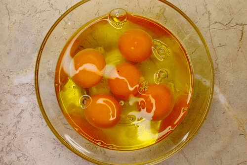 Яйца разбить в миску. Нарезать желток, но не перемешивать и не взбивать.