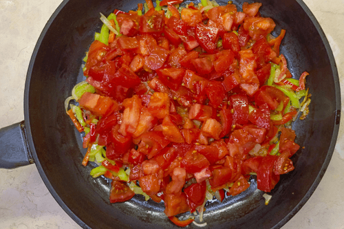 Добавить помидоры, посолить, поперчить, перемешать, накрыть крышкой, тушить 7–8 минут до готовности помидоров. Следить, чтобы сок не выпаривался. Если помидоры кислые, добавить сахар.