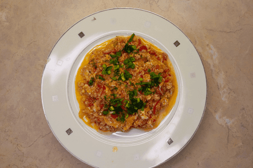 Яичница с помидорами – это яркое блюдо кавказской кухни, которое сочетает в себе простоту и насыщенный вкус. Истоки рецепта уходят в древние традиции горных народов, где свежие овощи и яйца составляли основу питания. Сладкий перец придаёт яичнице нежную сладость, а помидоры – легкую кислинку и сочность. Специи, зелень и пассерованный лук делают блюдо ароматным и богатым по вкусу. Яичница готовится быстро, а её текстура мягкая и воздушная, с приятными томатными нотами. Идеальна как самостоятельное блюдо или в сопровождении свежего хлеба. Её едят горячей, посыпая зеленью, наслаждаясь сочетанием свежести и пряных акцентов. Эта яичница – настоящий символ домашнего уюта и традиционной кавказской кухни, которая дарит ощущение теплоты и сытости.