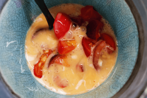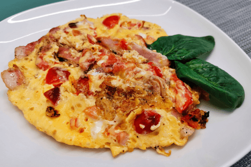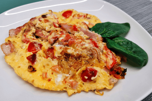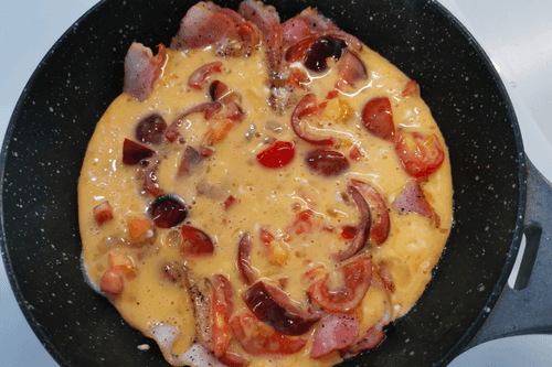 Яичница с беконом – это классическое блюдо европейской кухни, символ уютных завтраков и бодрящего утра. Простота его приготовления делает его идеальным для быстрого и вкусного начала дня. Хрустящий, золотистый бекон в сочетании с нежной яичной массой, дополненной пикантным соусом чили и сливочностью майонеза, создает насыщенный и сбалансированный вкус. Добавленные помидоры черри придают блюду сочность и легкую кислинку, освежая его и делая еще более аппетитным. Это блюдо не только питательно и сытно, но и универсально – его можно подавать как самостоятельное угощение или дополнять хрустящими тостами и свежими овощами. История яичницы с беконом уходит корнями в традиции английских завтраков, которые ценятся за свою питательность и насыщенность. Аромат этого блюда способен разбудить аппетит и наполнить дом уютом.