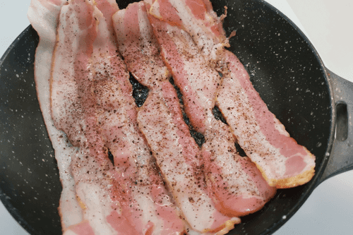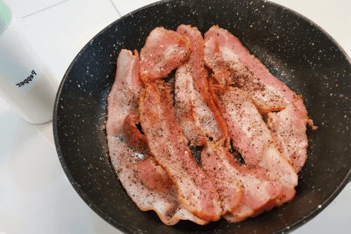 На сухую раскаленную сковороду выложить бекон. Поперчить.
