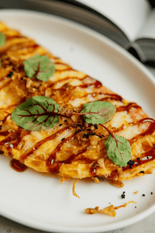 Переложить омлет на тарелку, полить соусом унаги и посыпать луком фри.