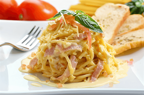 Тем временем, разогрейте небольшое количество оливкового масла в сковороде на среднем огне. Добавьте мелко нарезанный лук и жарьте до мягкости и золотистого цвета примерно 3 минуты. Затем добавьте нарезанную небольшими кусочками ветчину и обжарьте еще минуту. Добавьте готовую лапшу, посолите и поперчите по вкусу.