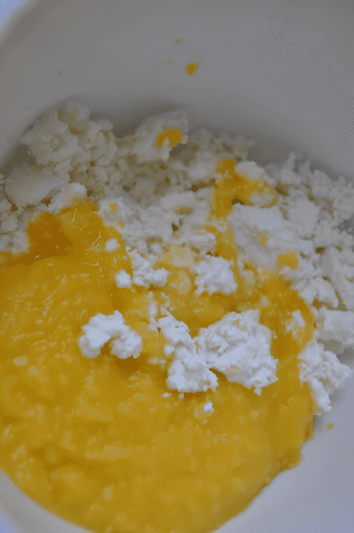 Положить в глубокую тарелку творог и залить получившейся смесью. Перемешивать ложкой по желанию.
