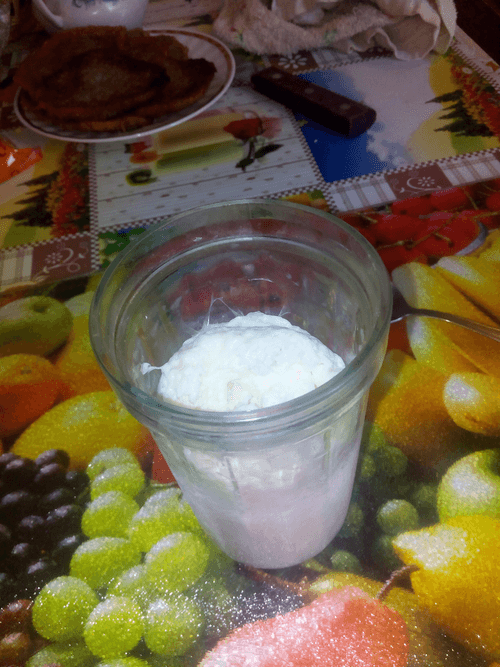 Взять два стакана с толстыми стенками. Выложить подготовленную смесь в стаканы.
