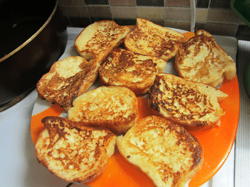 Хлеб нарезать полосками, окунуть в яичную смесь и обжаривать на топленом масле.