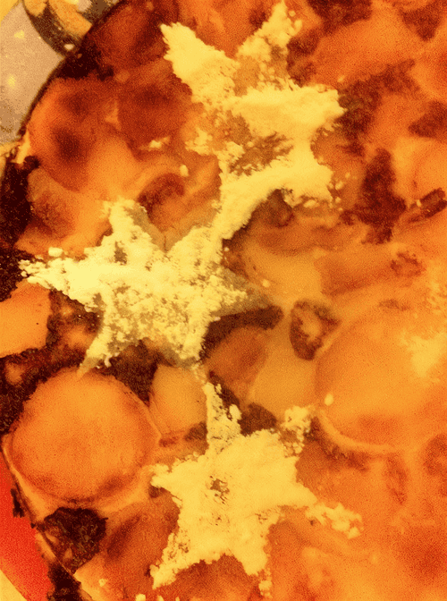 Украсить сверху яблоками, посыпать сахаром и смазать сметаной.