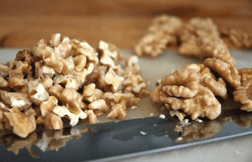 Орехи мелко нарубить и добавить к готовой пшенице.