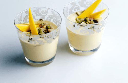 Разложите йогурт по креманкам, сверху посыпьте слегка измельченными фисташками. Украсьте дольками манго. Накройте парфе пищевой пленкой и отправьте в холодильник на несколько часов или для удобства на ночь.
