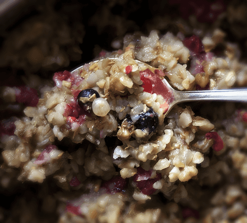 2 — добавляем смесь ягод и снова перемешиваем — мягкая ягода малина должна совсем слиться с структурой отваренной крупы, а с жесткой оболочкой смородина должна сохраниться целой.