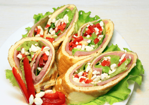 На омлет выложить кусочки тонко нарезанной ветчины, листья салата, творог с перцем. Свернуть рулетом, порезать наискосок.